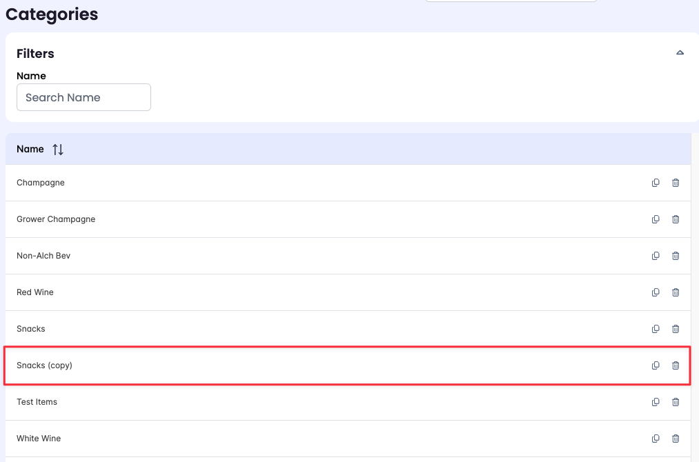- The copied Menu Category is automatically added to the category list containing the ‘(copy)’ identifier. Click the copied Menu Category.