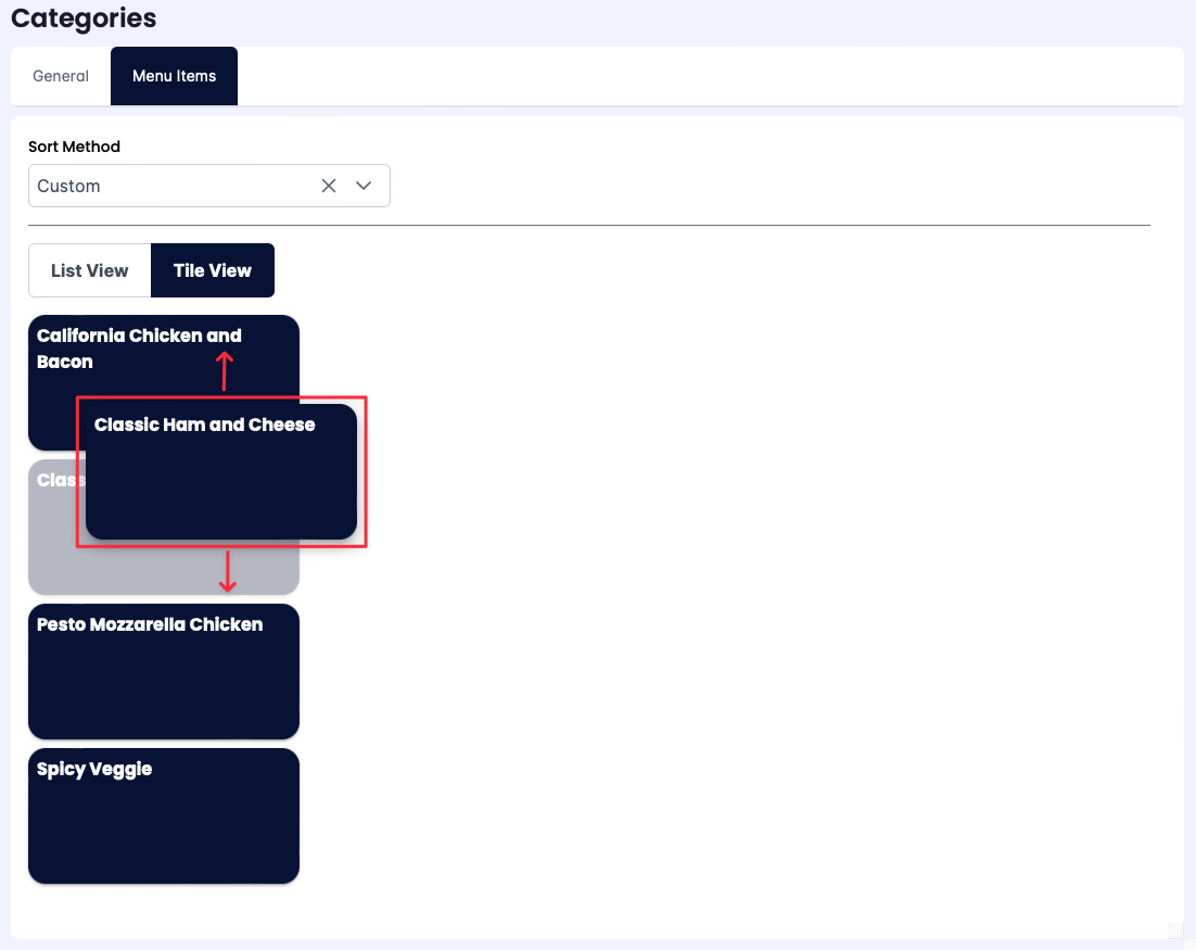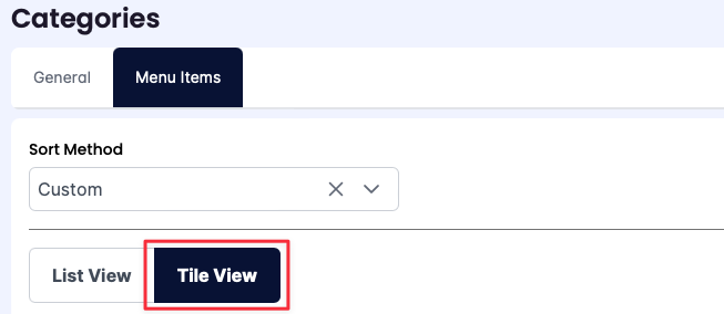 Click Tile View to manually sort the Menu Items within the Menu Category.