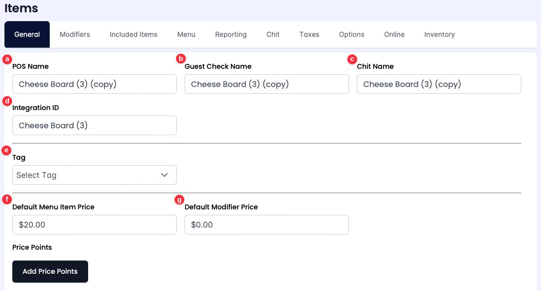 The copied menu item’s Price Points are carried over from the original item. After copying a menu item, you can add, modify, or remove previously configured Price Points to the new item. The General tab contains the menu item’s price points.Â