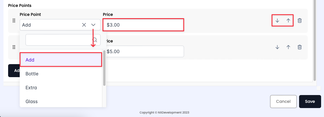 - To modify the order in which the price points prompt for selection, use the up and down arrows to sort. Additionally, you can manually order the price points by clicking and dragging using the (