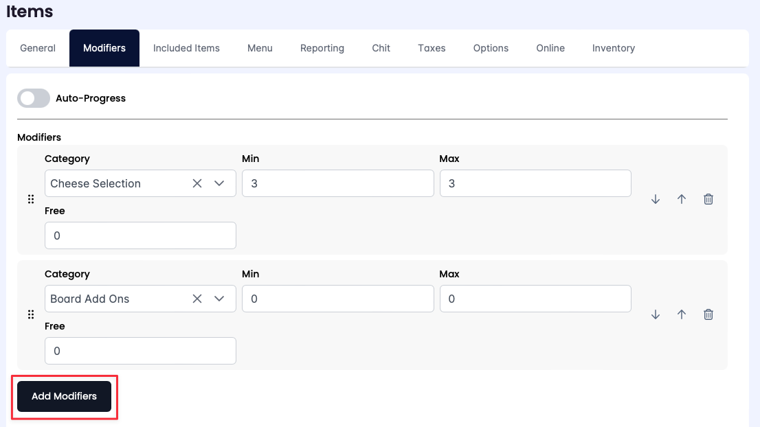 When copying a menu item, the Modifiers are retained from the original. In some cases, you may wish to update the modifiers for the new copied menu item. Modifiers can be added, changed, and removed. The modifiers can be updated on the Modifiers tab.Â