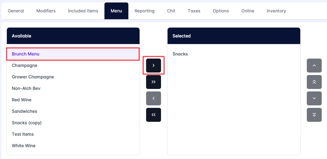 - Add a new menu category by clicking to highlight the category name from the Available list, and then clicking the right arrow. This moves the category from the Available list to the Selected list.