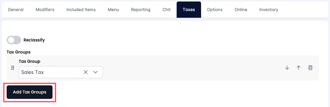 - To remove a Tax Group that was carried from the original menu item, click the trash can icon (