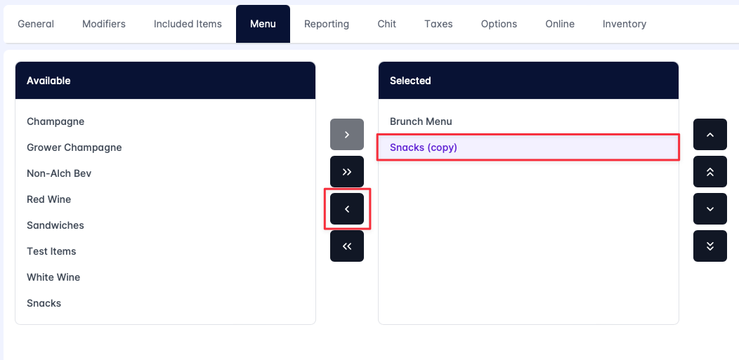 - Remove a menu category by clicking to highlight the category name from the Selected list, and then clicking the left arrow. This moves the category from the Selected list to the Available list.