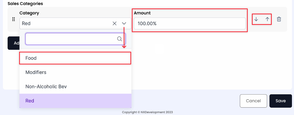 - Manage the percentage of the menu item that reports to the added Sales Category by using the Amount textbox.