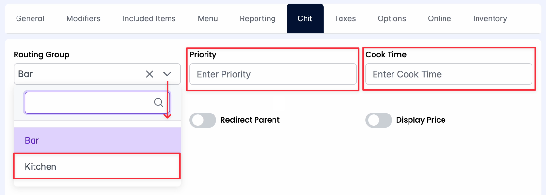- Use the Routing Group drop-down menu to adjust the preparation station that receives the item after ordering.