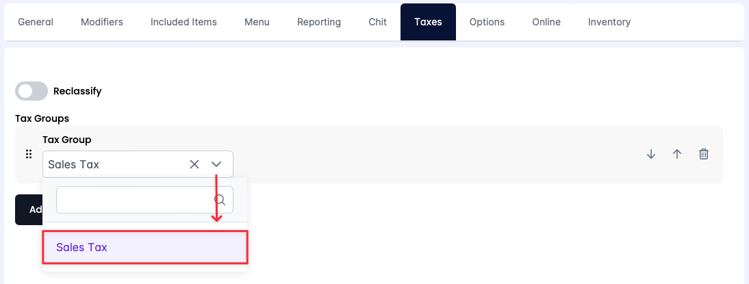 - Use the Tax Group drop-down menu and select a previously configured Tax Group.