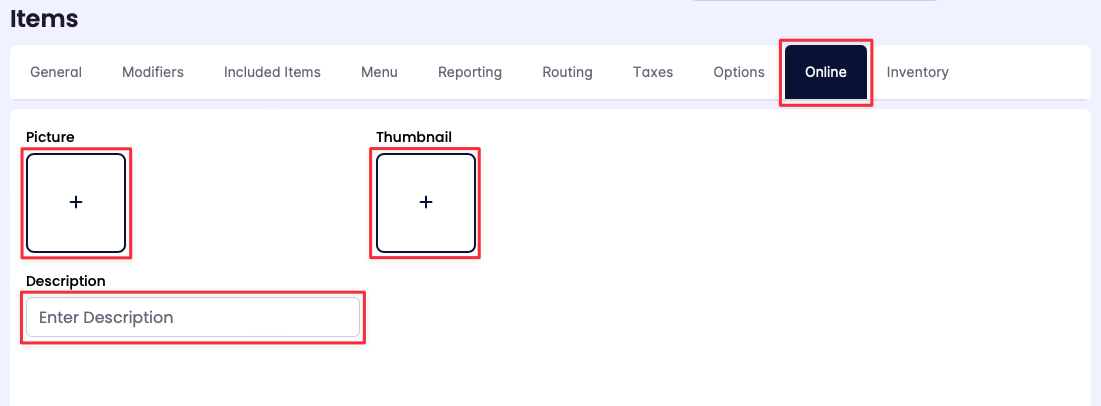 - Click the (+) under Thumbnail to upload a thumbnail image of the menu item. Thumbnail images enhance the visual appeal of an online ordering menu by attracting customers to explore additional options for a menu item.