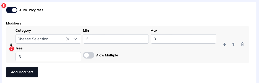 - (Optional) Click the Auto-Progress slider to automatically progress to the next modifier options when the Min/Max requirements are met. If there are no other categories, then the modification screen will close.