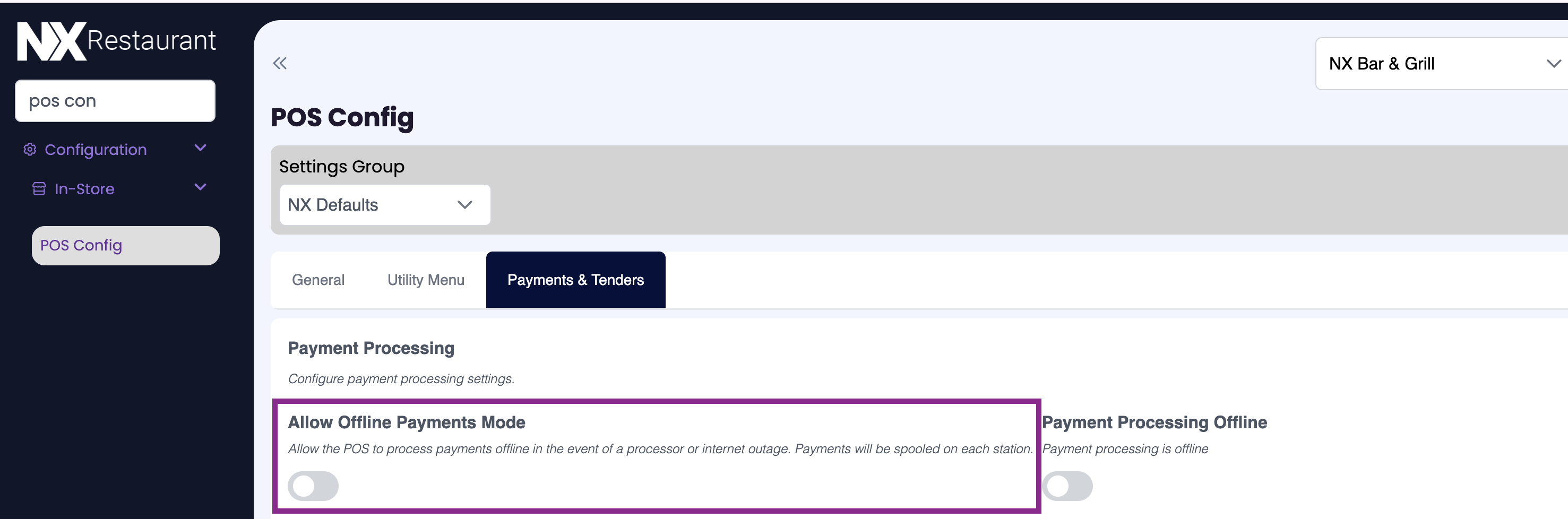 NX Portal > Configuration > In-Store > POS Config > Payments & Tenders > Allow Offline Payments Mode