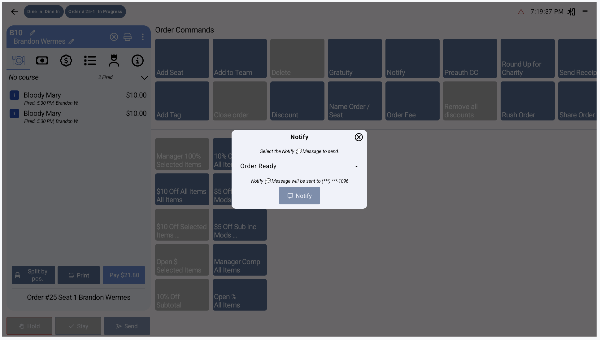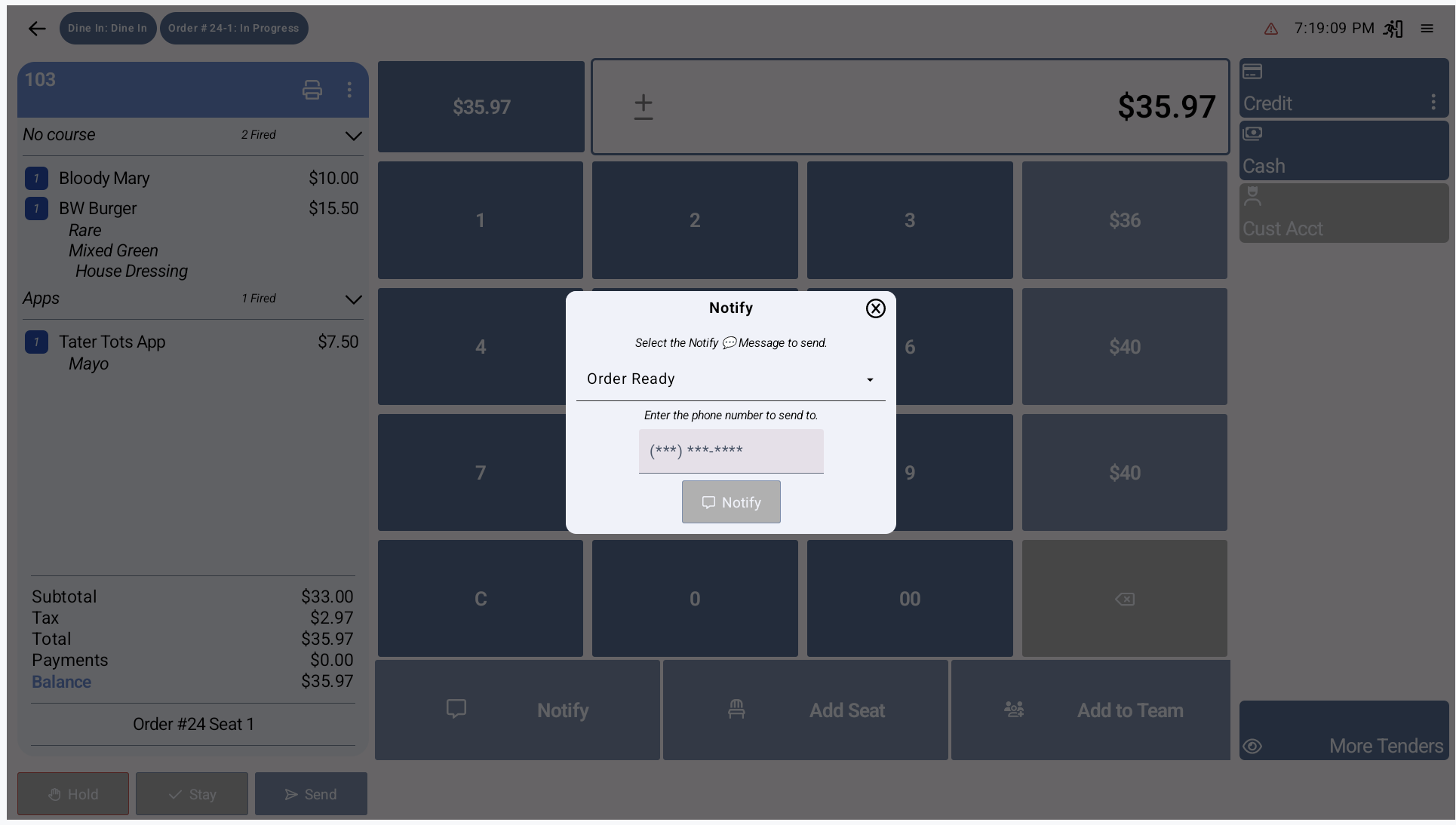 With Notify 💬, your venue can automatically or manually send SMS messages to customers based on order activity.