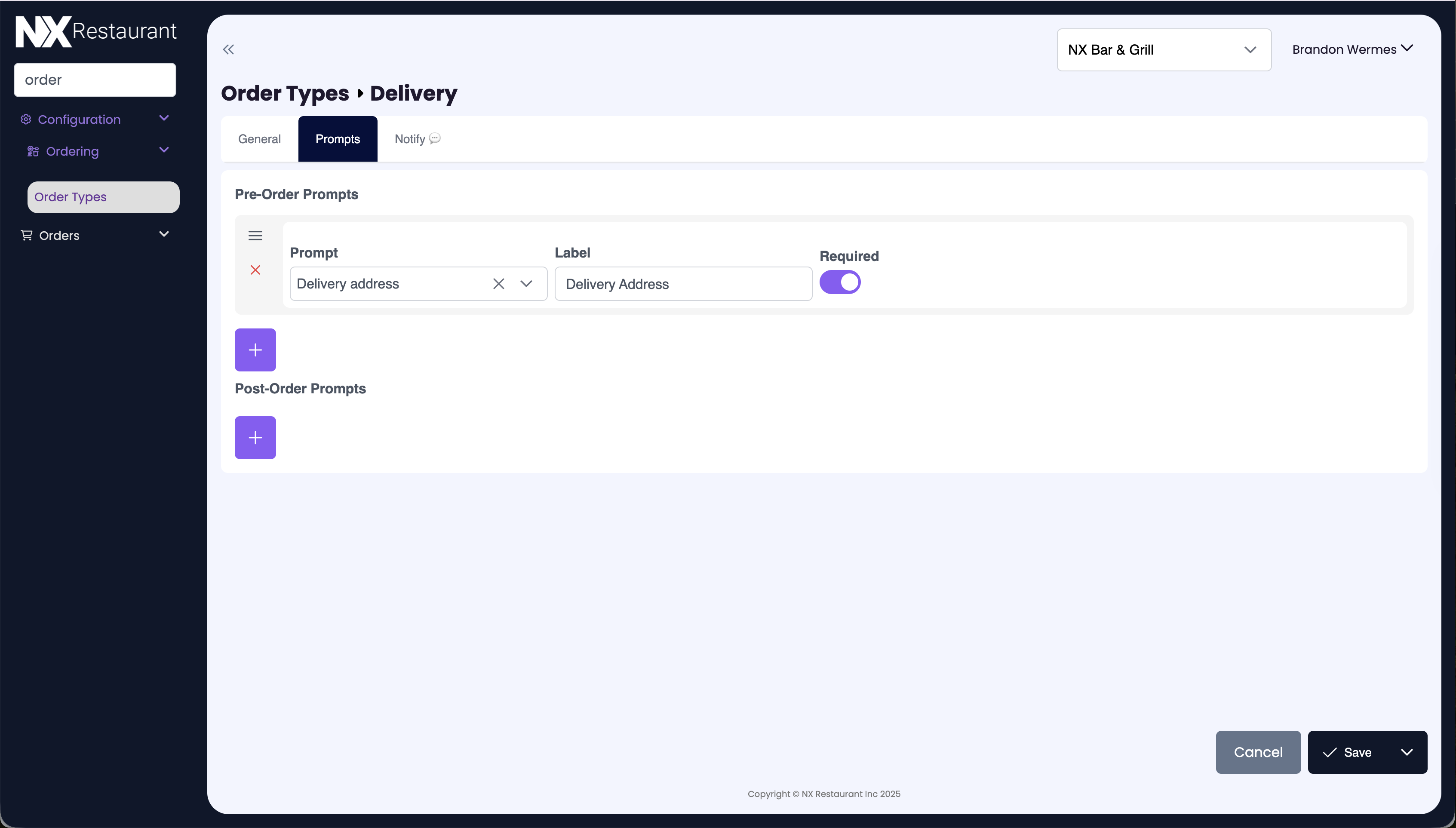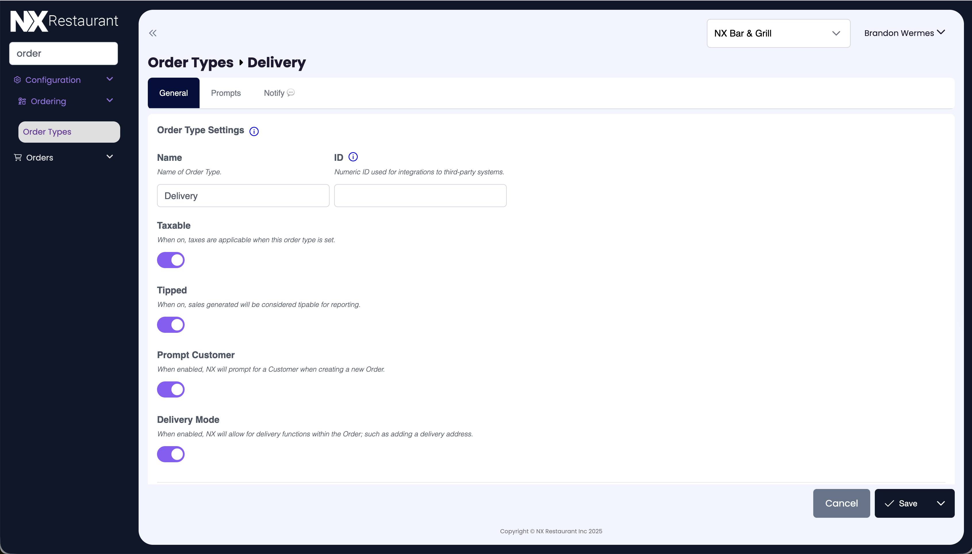 Select an existing order type (such as โDeliveryโ) or create a new one.