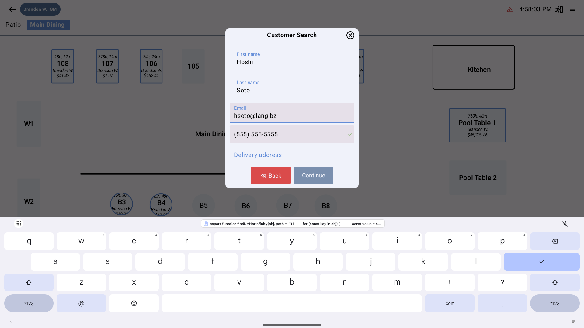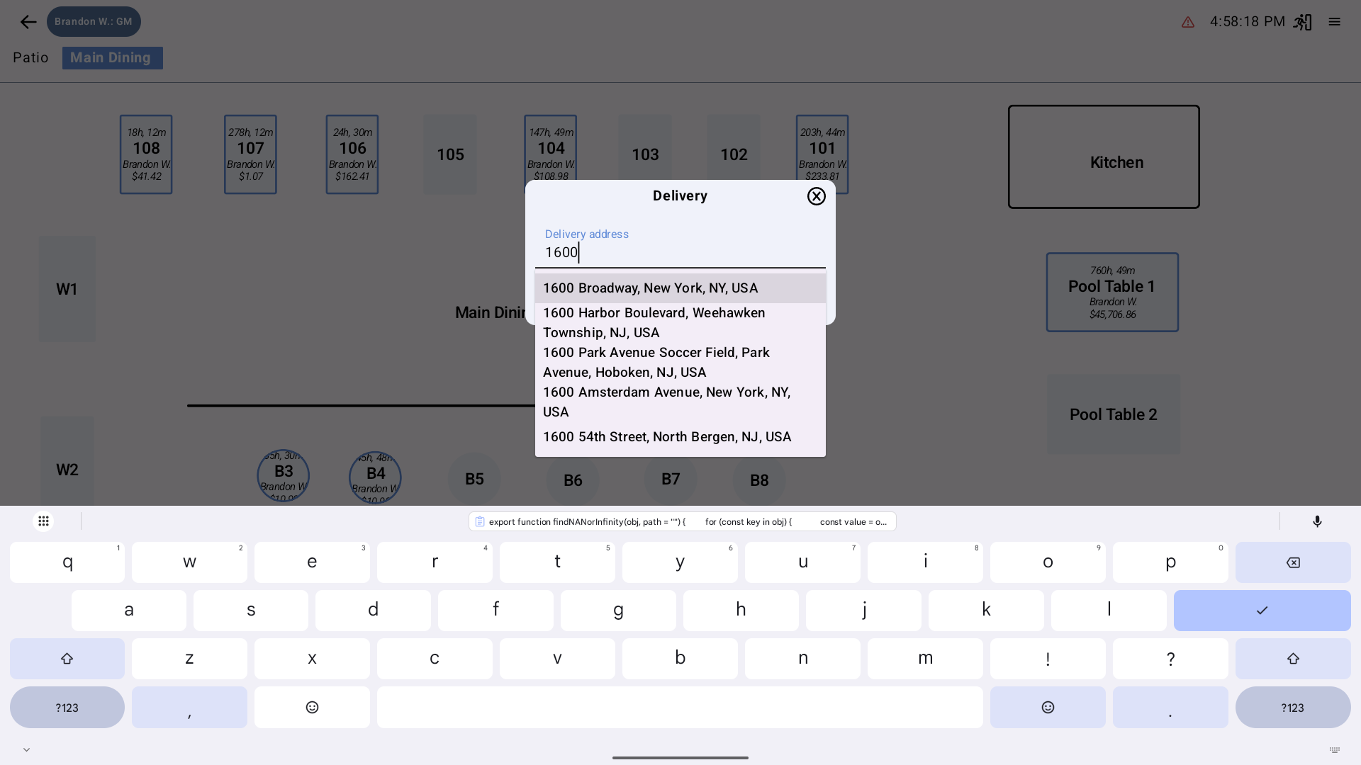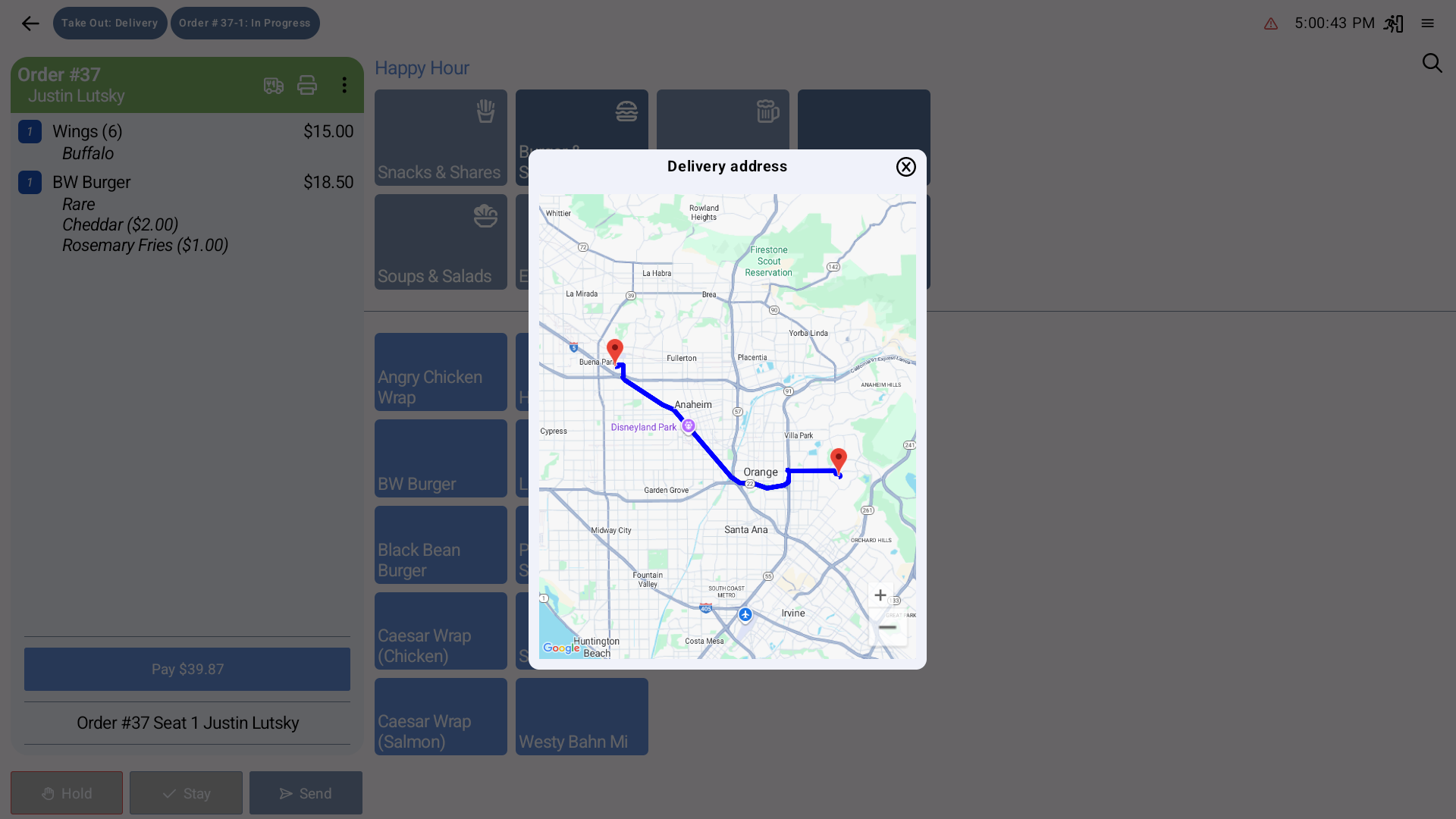 By enabling Delivery Mode, servers can create delivery orders that automatically prompt for a customer and an address, with built-in Google Maps lookup and navigation.