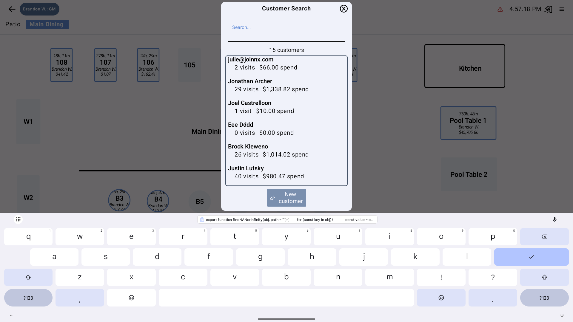 The search dialog displays customer history, visit count, and spend.