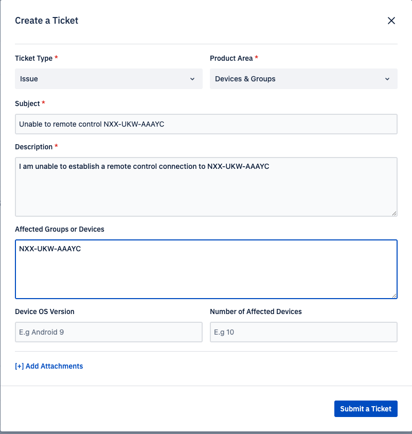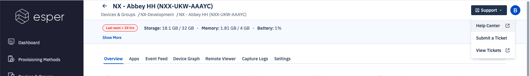 If you encounter any problems controlling, provisioning, or communicating with your NX devices via the Esper Console, you’ll need to create a Support Ticket directly within Esper.