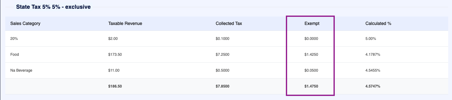 A dedicated Exempt column shows the exempted tax amounts per category.