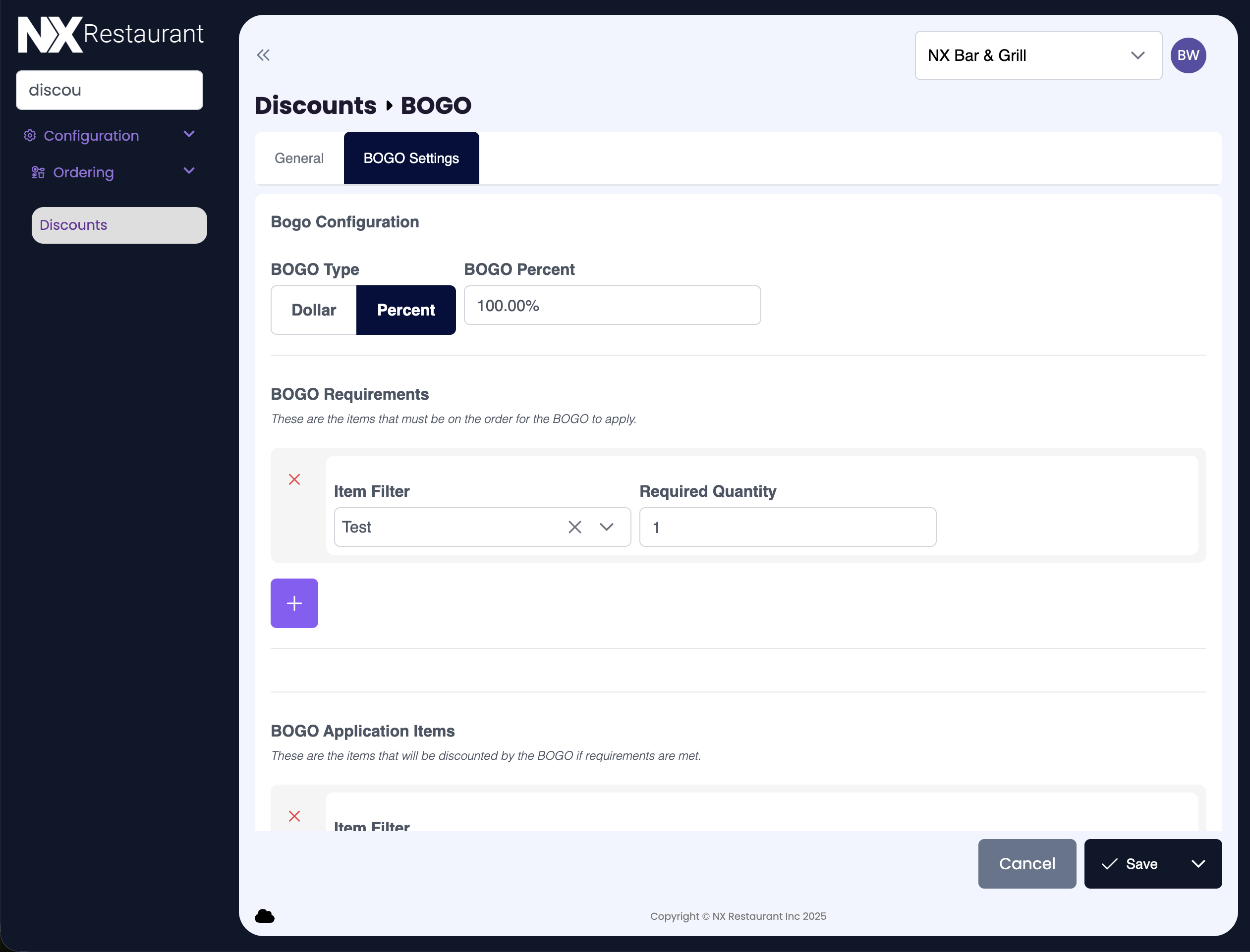 Note: The system will only allow the BOGO discount to be applied if items matching the Requirement Menu Filters are present on the order.