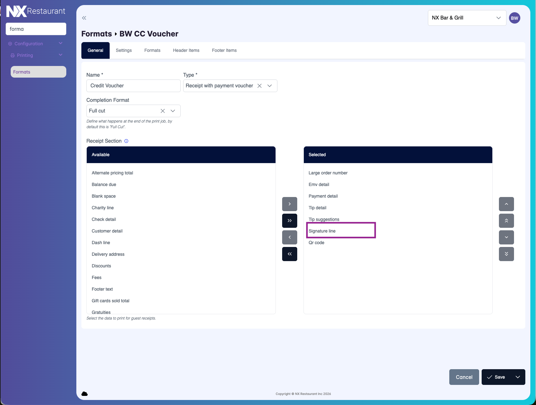 Before anything else, you must tell the system that a signature line is a piece of data you want on your receipts. Without this, the line will never print, regardless of other settings.