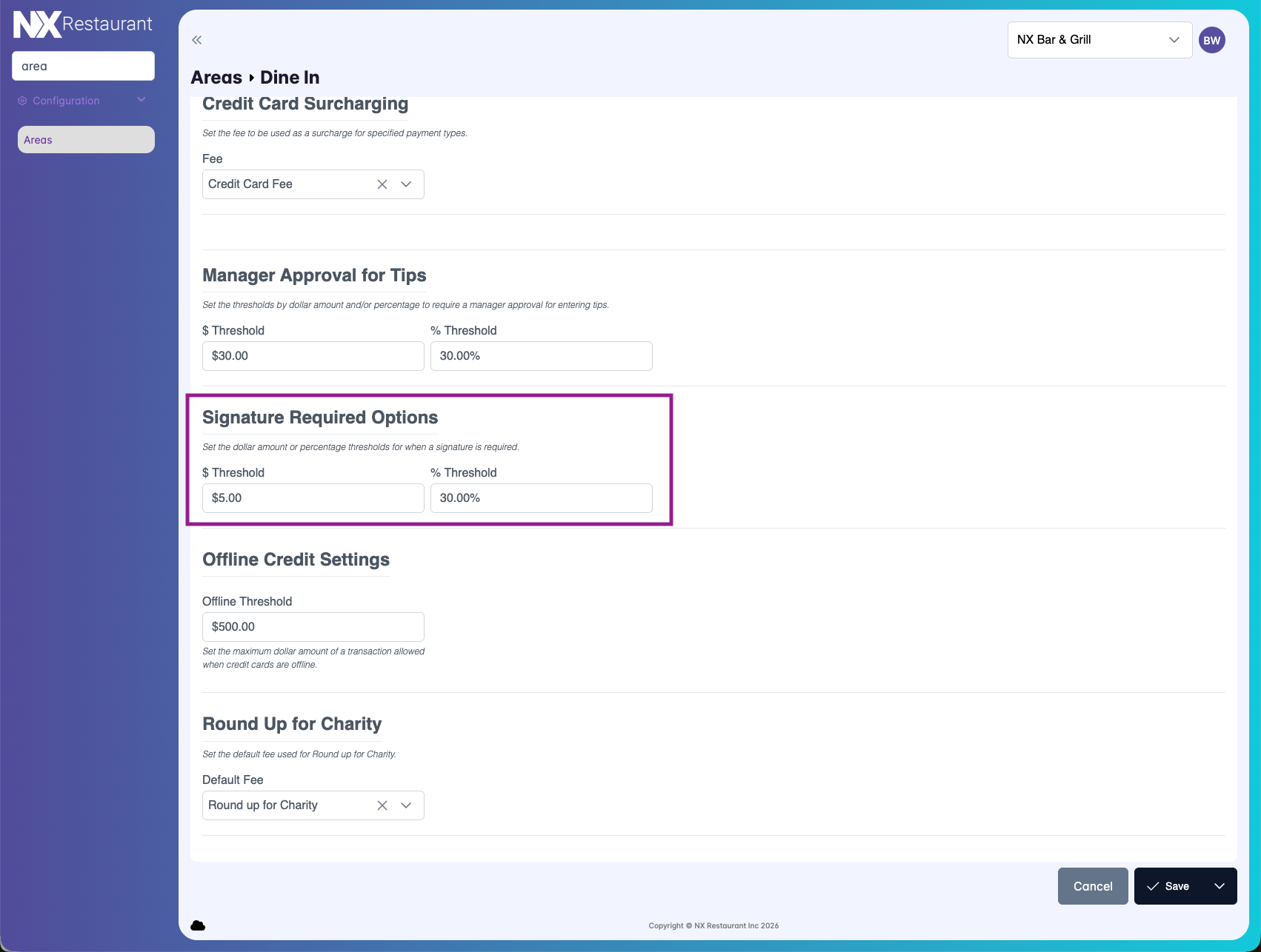 Most restaurants prefer to only require signatures for larger transactions to speed up service. You can set a specific dollar amount or percentage in the Areas section.