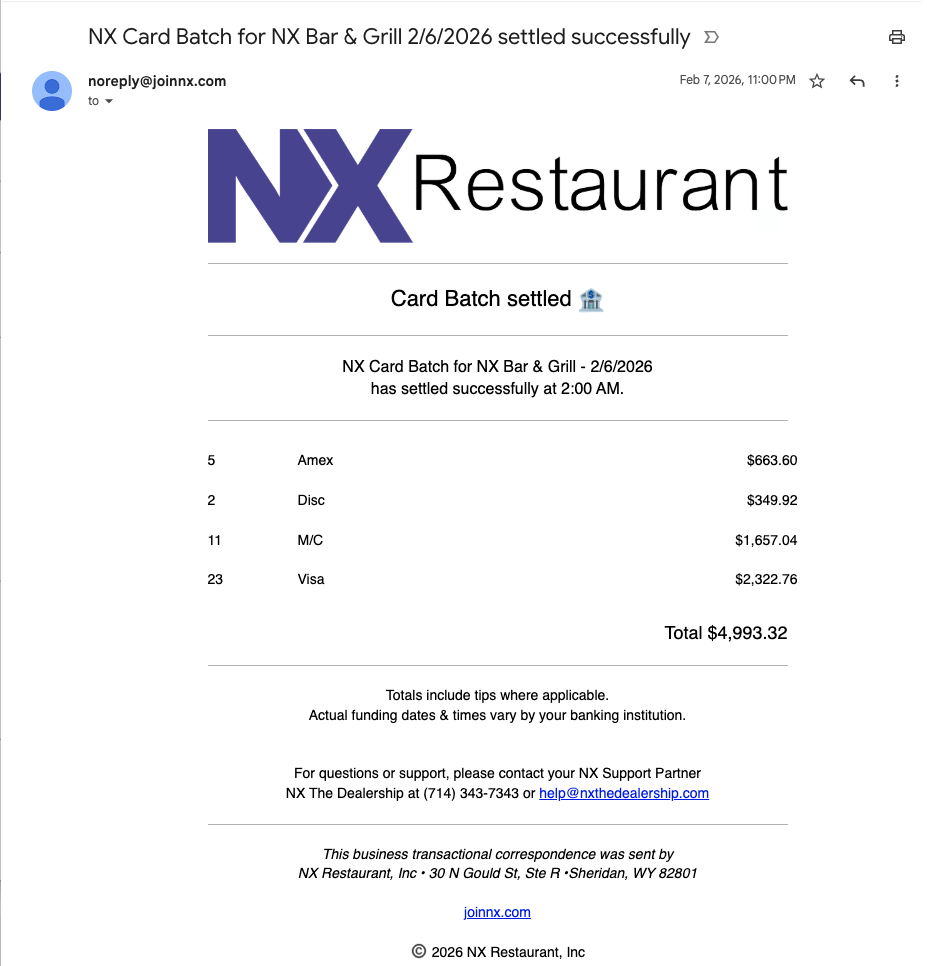 Running a busy restaurant means you need to know exactly what’s happening with your finances without having to dig through reports every morning. With Daily Card Batch Notifications, NX Restaurant automatically sends a summary of your credit card settlements straight to your inbox!