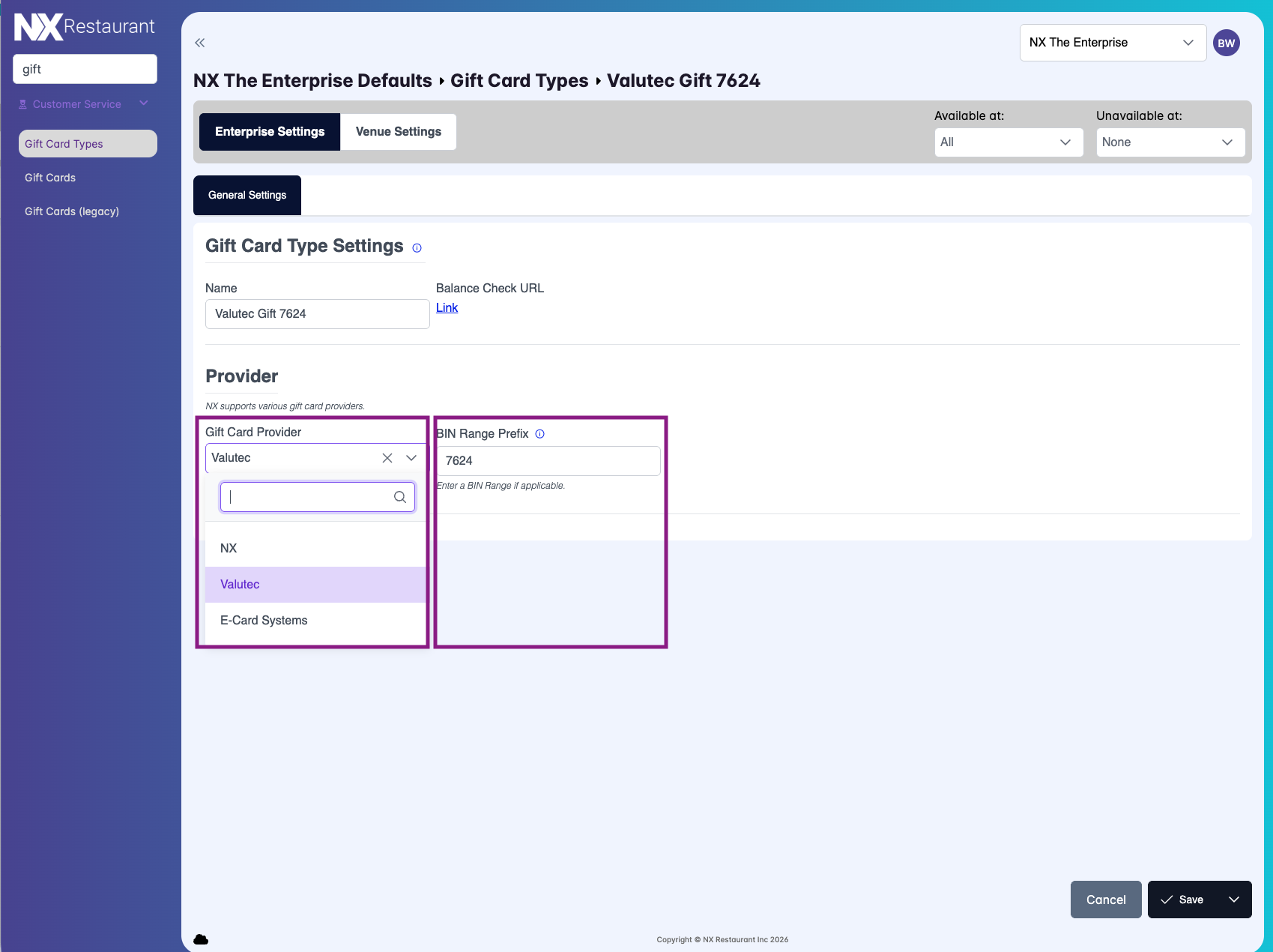 In the NX Portal, go to Enterprise Settings > Gift Card Types.