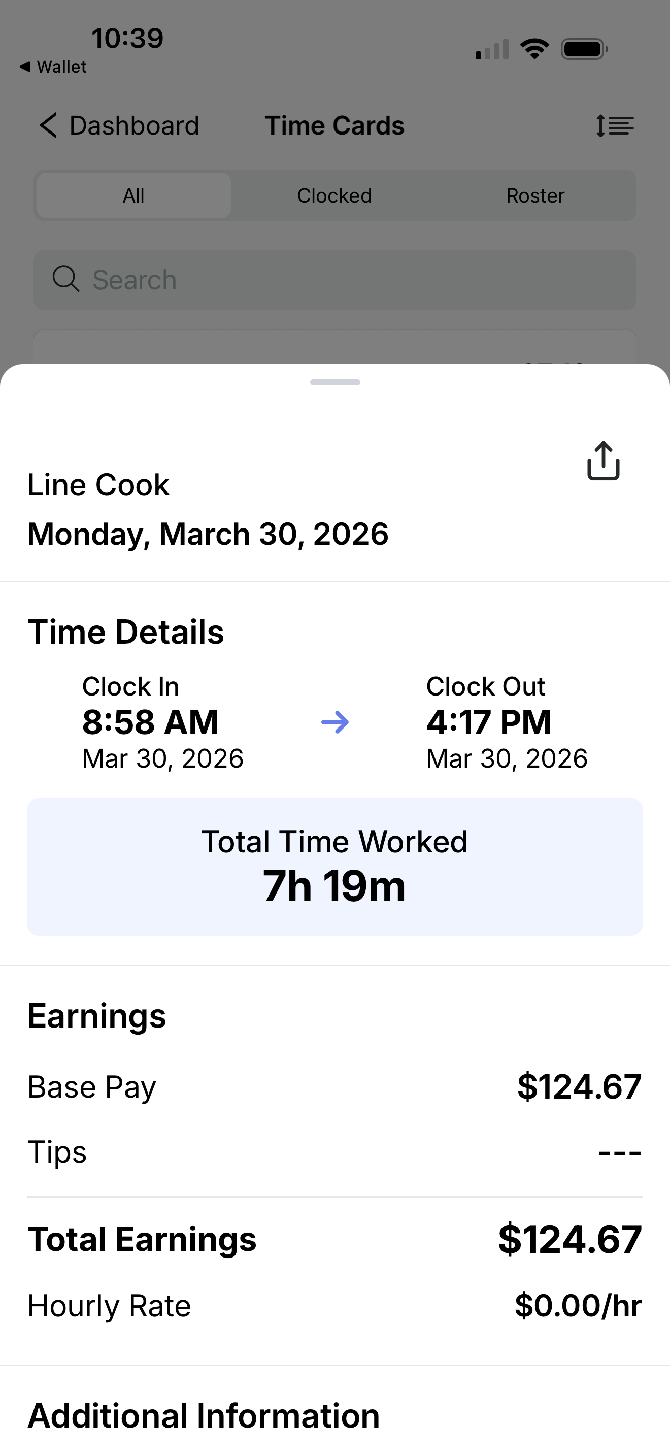 Tap any employee's name to view their specific Shift Details. This view is broken down into three sections to give you a full picture of their day:
