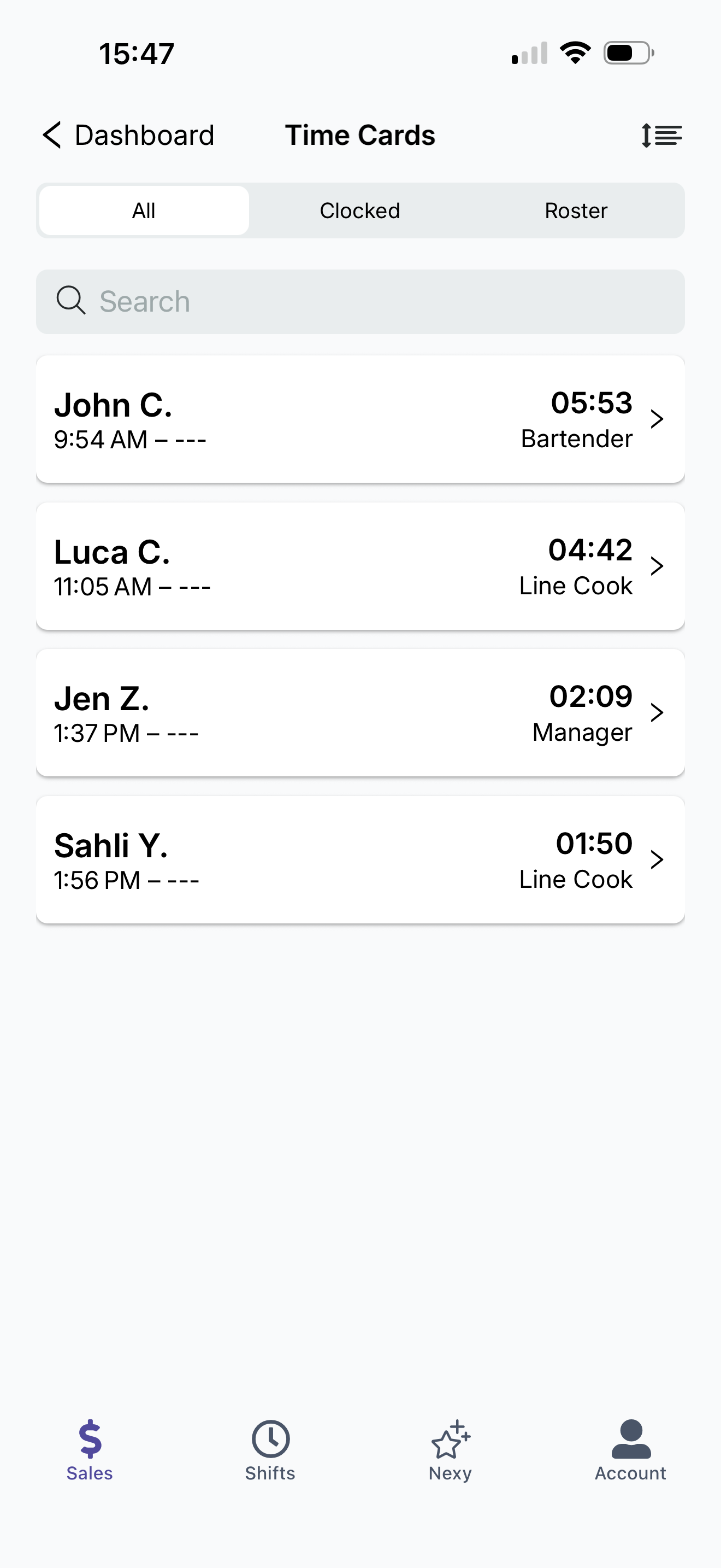 Check Next Shifts: For venues using NX Shifts, you can see each person's "Next Shift" directly under their name, making it easy to plan ahead.