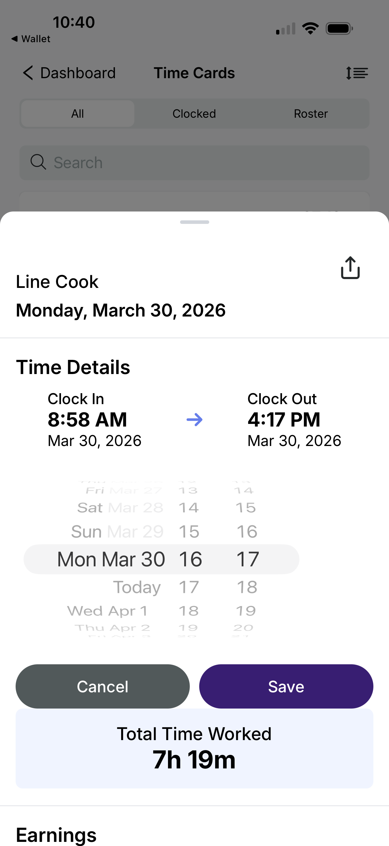 Managers can edit time cards directly through the NX POS terminal or Back Office. Once an edit is saved there, pull down on the list in the mobile app to refresh and see the corrected hours. π