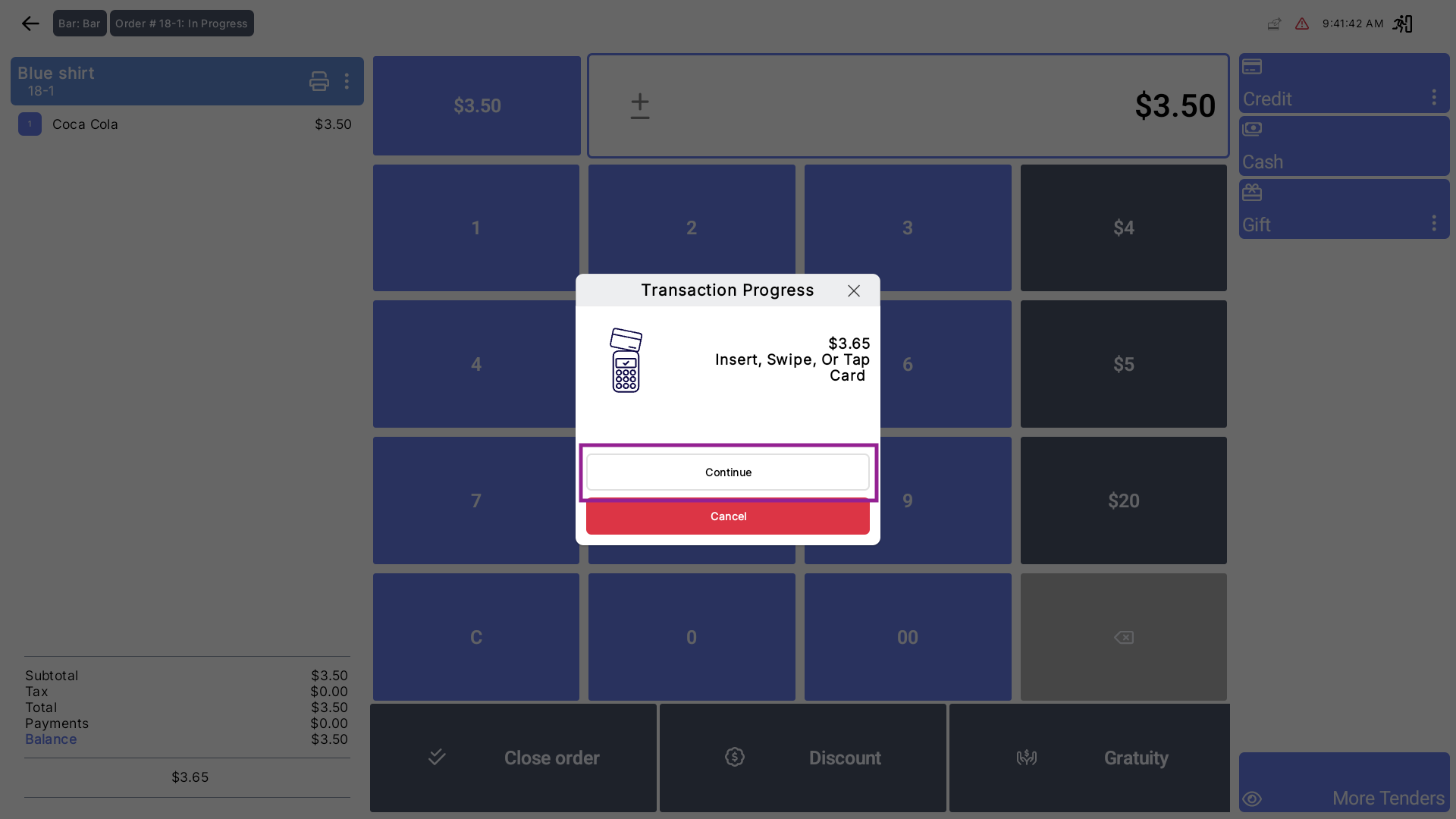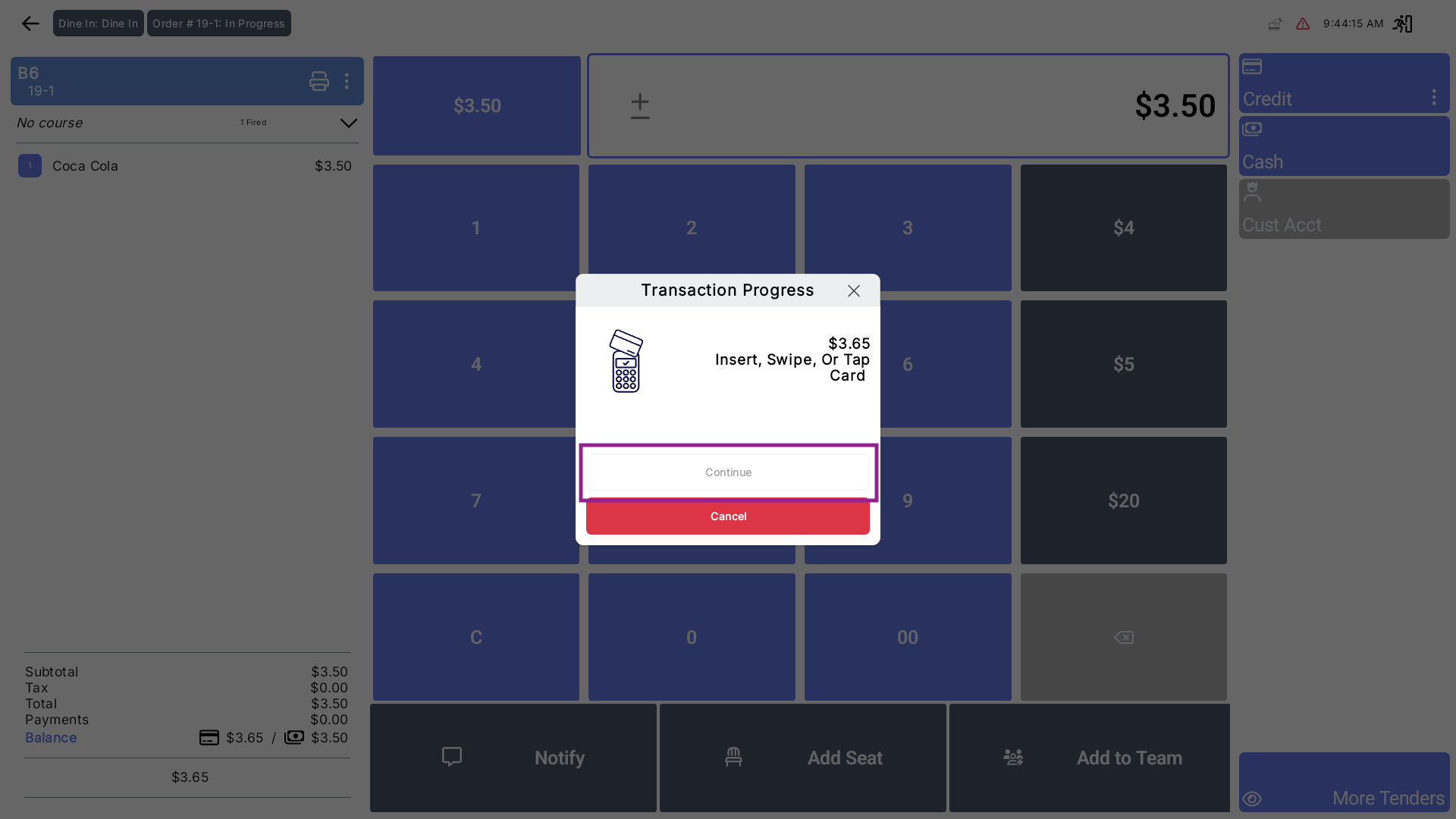 When you swipe, dip, or tap a card, the Transaction Progress window appears. You will notice the Continue button is greyed out or removed. You must wait for the transaction to complete or hit Cancel.